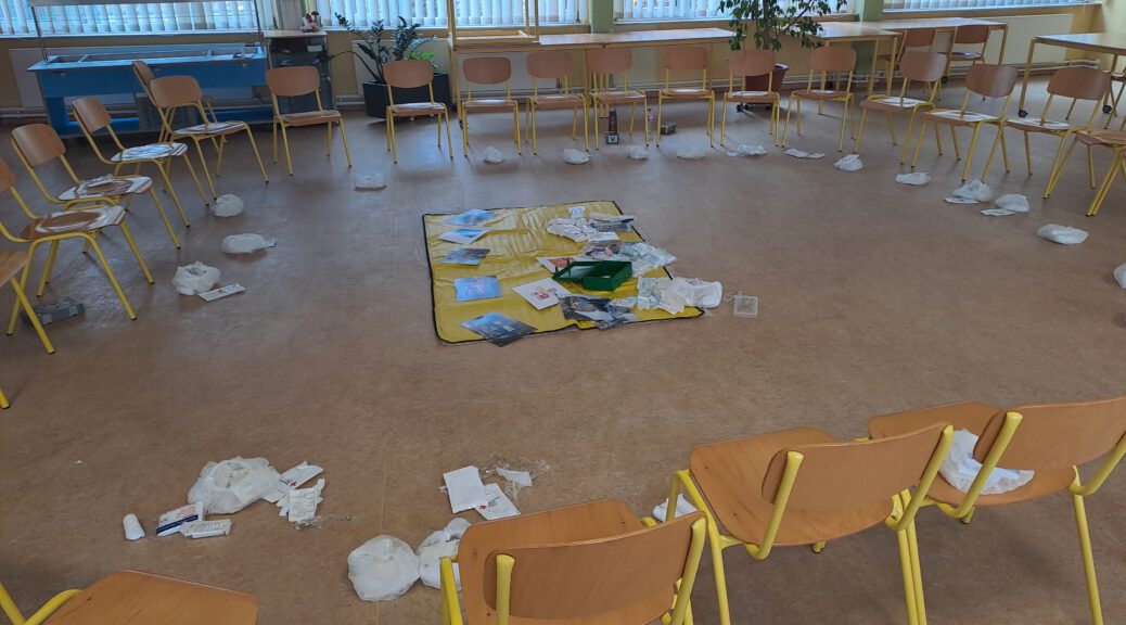 In der 1.Stunde am 26. September sind wir in den Speisesaal gegangen und haben vom DRK einen Erste Hilfe Kurs bekommen. Zuerst haben wir ein Spiel zu allen wichtigen Regeln gespielt. Dann wurde uns erklärt wie man ein Pflaster, Binden und vieles mehr benutzt. Wir haben unseren Partnern aus einem Dreieckstuch eine Armstütze gebunden. Danach haben wir einen Verband um die Hand unseres Partners angelegt und ein Fingerkuppenpflaster angeklebt. Am Ende haben wir viele Fragen gestellt. Anschließend war es leider schon vorbei. Es hat uns viel Spaß gemacht. Vielen Dank an das DRK Team!